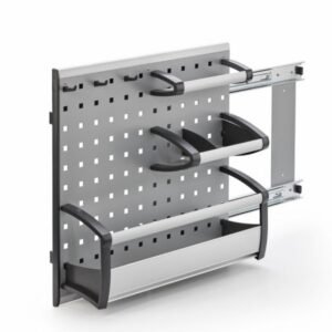 Uittreksystemen voor poetsmiddelen is dankzij het slanke ontwerp met twee schappen kan het geïntegreerd worden in de keukenonderkast om ruimte te besparen. De basis is een systeemsteun waarop de twee grote containers worden geplaatst. De afneembare hangmand met draaggreep blijkt bijzonder praktisch te zijn, omdat alle schoonmaakproducten gemakkelijk kunnen worden meegenomen van de keuken naar de badkamer en naar elke andere plek in het huishouden. Andere functies zijn een kleine container en zes verdelers voor een flexibele indeling van de ruimte. De systeemlade is stevig vastgeschroefd aan de kastbodem.